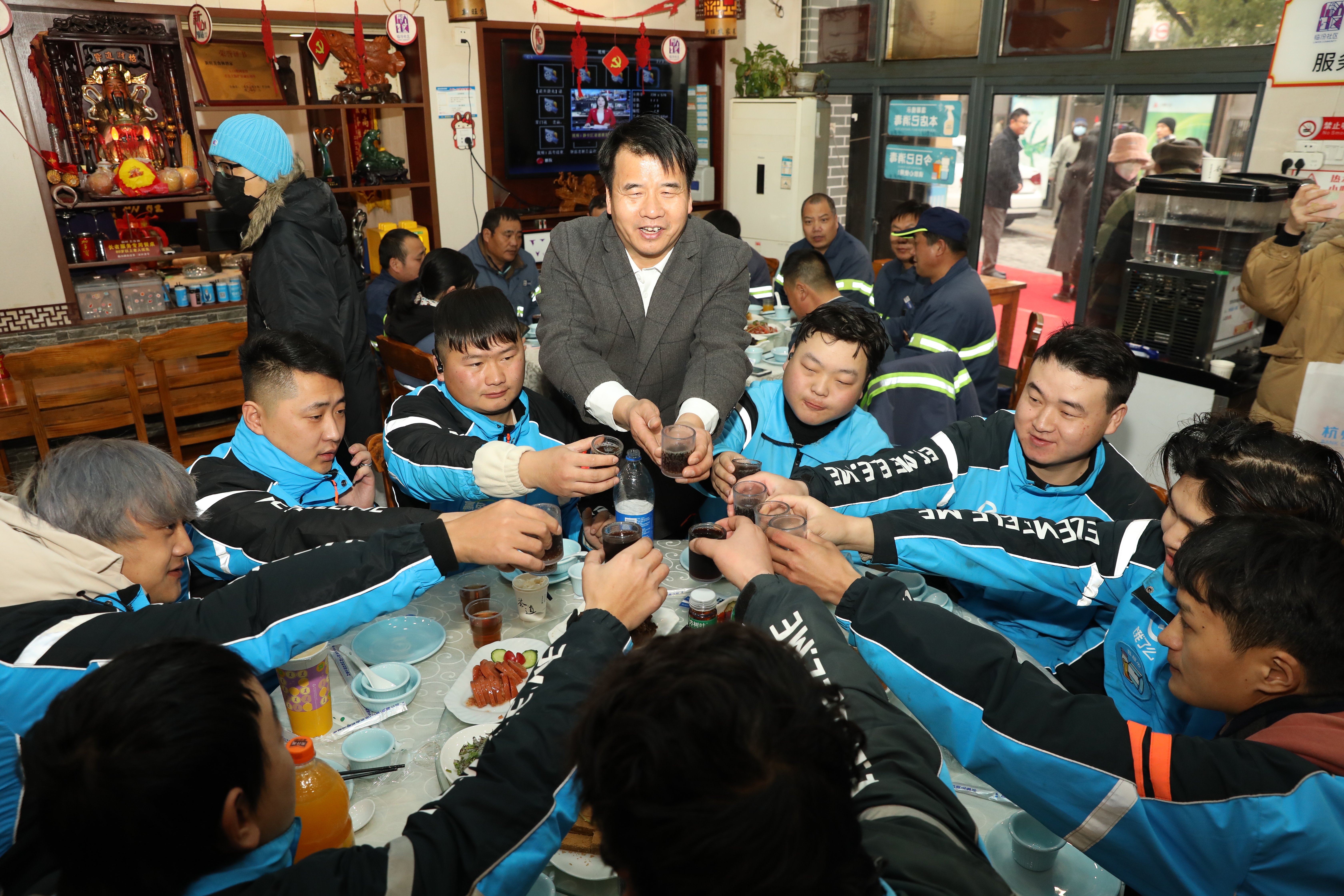 大堂的5张桌子都已经坐满,50名外卖骑手、快递员等“城市奔跑者”济济一堂,一年“跑”到头,也坐下来歇歇脚,吃顿团圆饭。