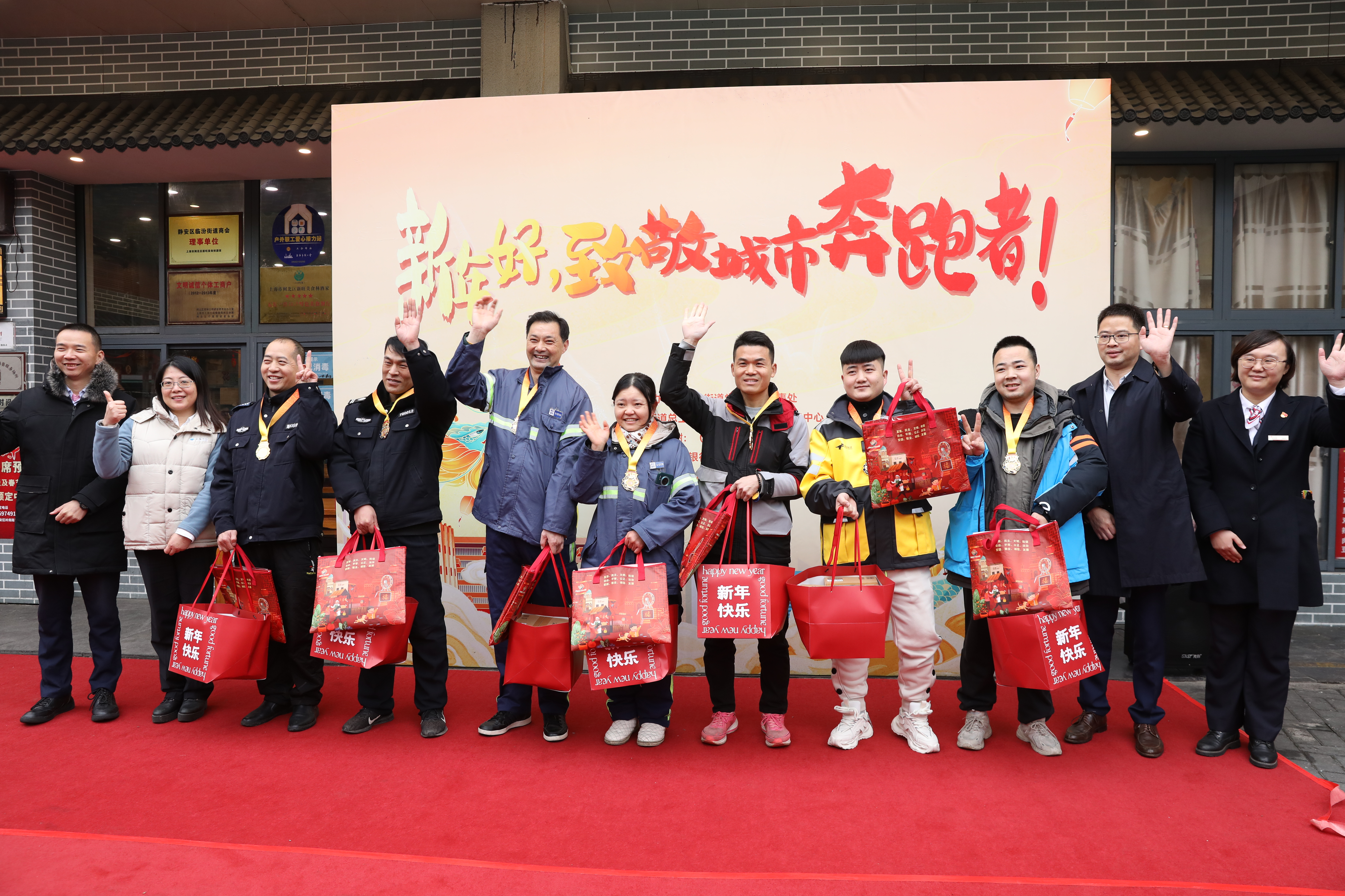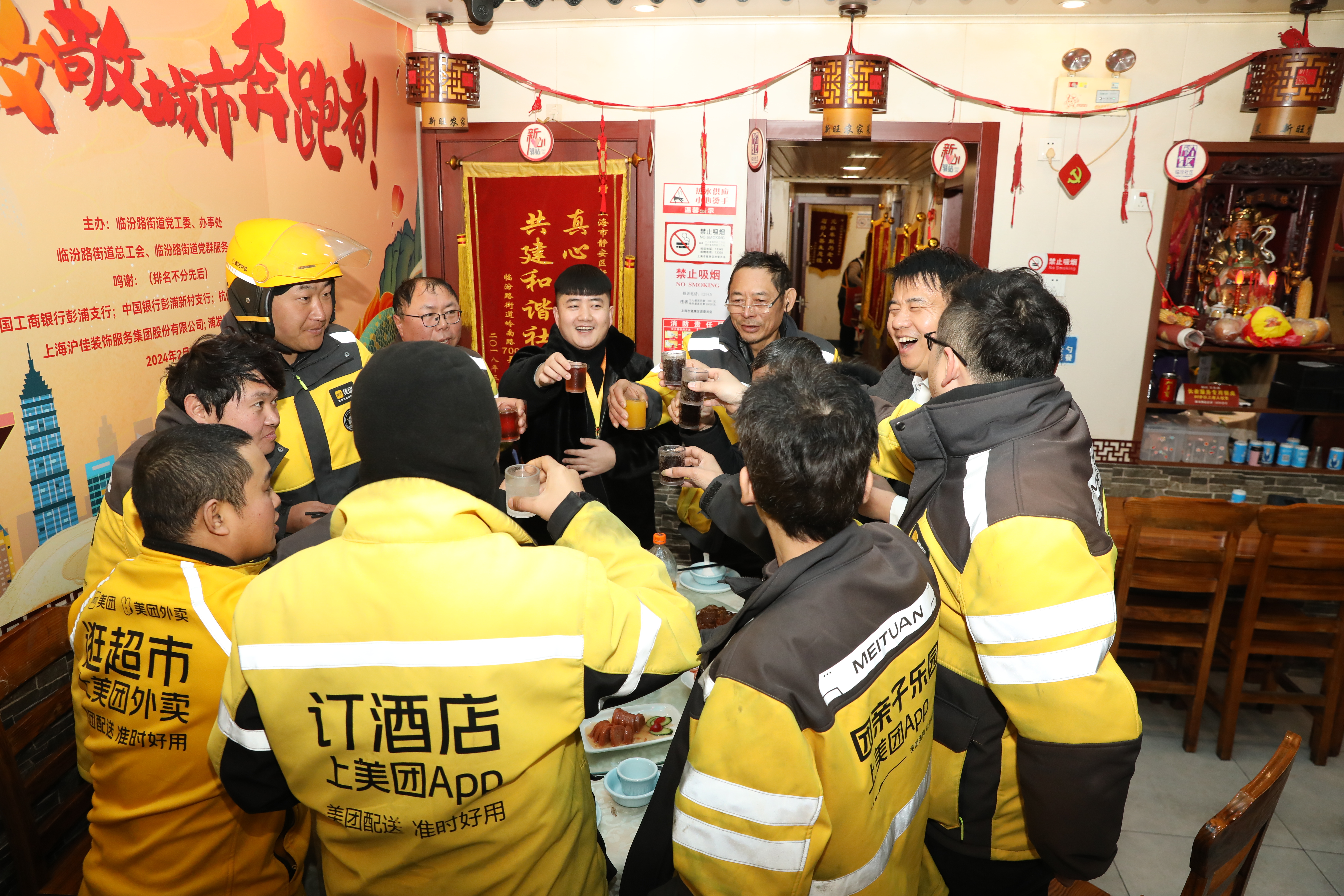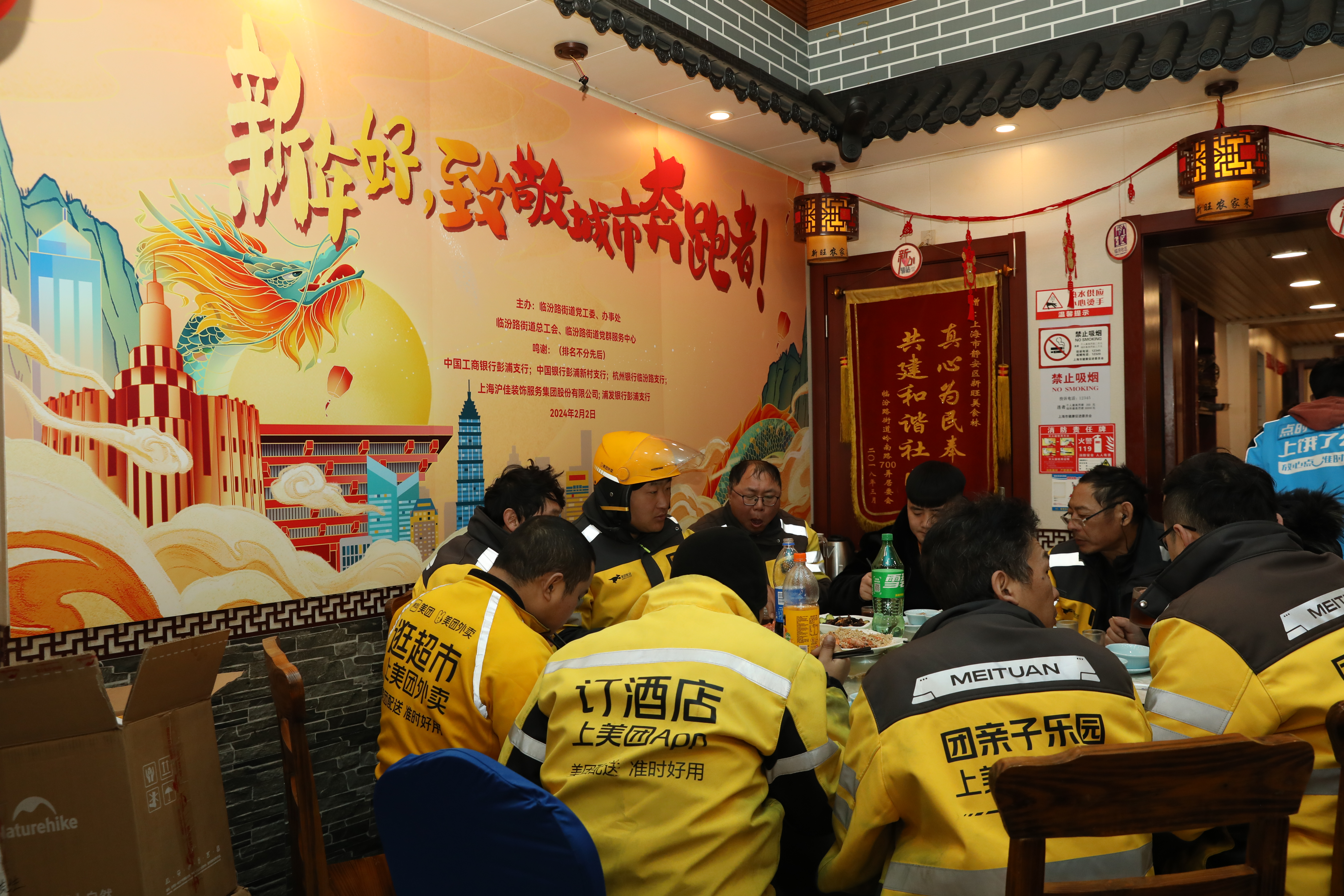 这是新春前夕的一次新就业形态劳动者关心关爱活动。静安区临汾路街道,典型的居住型社区,2.21平方公里面积有700多家小商户,他们是创业者、劳动者,服务着社区居民的生活,也应是被服务的对象。“新年好,致敬城市奔跑者!”的主题鲜亮亮张贴在大堂,临汾路街道各方协同发力,拿出各自资源,给奔波了一年的小哥们热闹的团圆饭。
