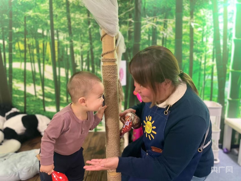 宝宝屋内,七七正在和这里的保健老师仇梦璇开心互动 (央广网记者 沈梅 摄)