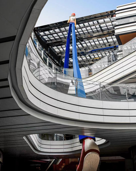 Inges Idee此次打造的作品包括两个大型户外永久艺术装置“迈上!”及“大象亲子乐团”,分别伫立在上海苏河湾万象天地西里与东里中庭,纵向跨越两层商业空间,寓意艺术与商业携手迈上全新景象,为城市生活带来赏心悦目的艺术观赏体验。