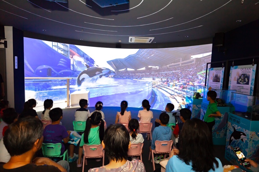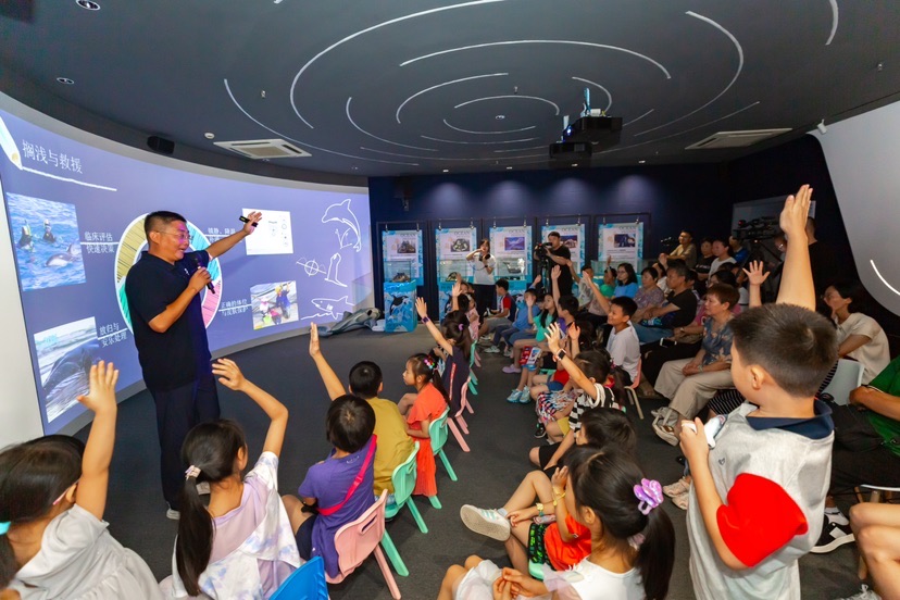 活动当天,在石门二路社区文化活动中心内东方社区数字苑的沉浸式数字展厅,上海海昌海洋公园生物研究所所长牟恺博士以《野生鲸类保护》为主题,开启了海洋科普课堂进社区的首场活动。通过海洋科普长廊和海洋环保相关定制概念展品、仿生江豚模型、企鹅蛋标本等实物展品,向现场的亲子家庭、居民代表讲述丰富多样的海洋生物科普知识。此外,全市215个街镇(乡)的东方社区数字苑也同步视频直播了本场海洋科普课堂,真正让海洋文化走进社区。