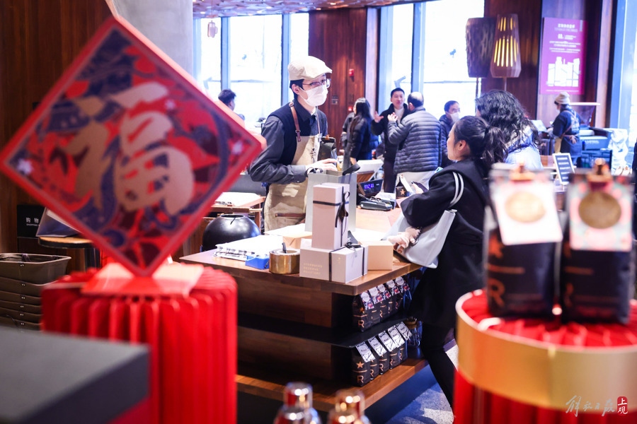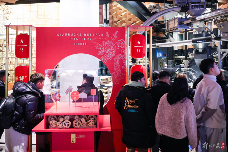 星巴克臻选上海烘焙工坊内,也布置上了新春气息的美陈。