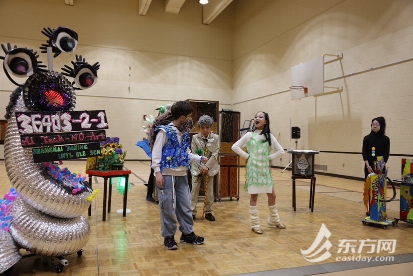 在参赛队员“太空深处的结构”题目的演绎中,太空深处的科学家可以是一只兔子,也可以是一个吸血鬼。在“人工智能装置”题目比赛中,上海市大宁国际小学在情节设计上,利用装置穿越回过去和梵高相遇,实现未来和过去的对话,共同探讨艺术的本质。从情景创设、情节创作到道具制作、技术攻关和表演风格,参赛队员脑洞大开,给出自己的解决方案。