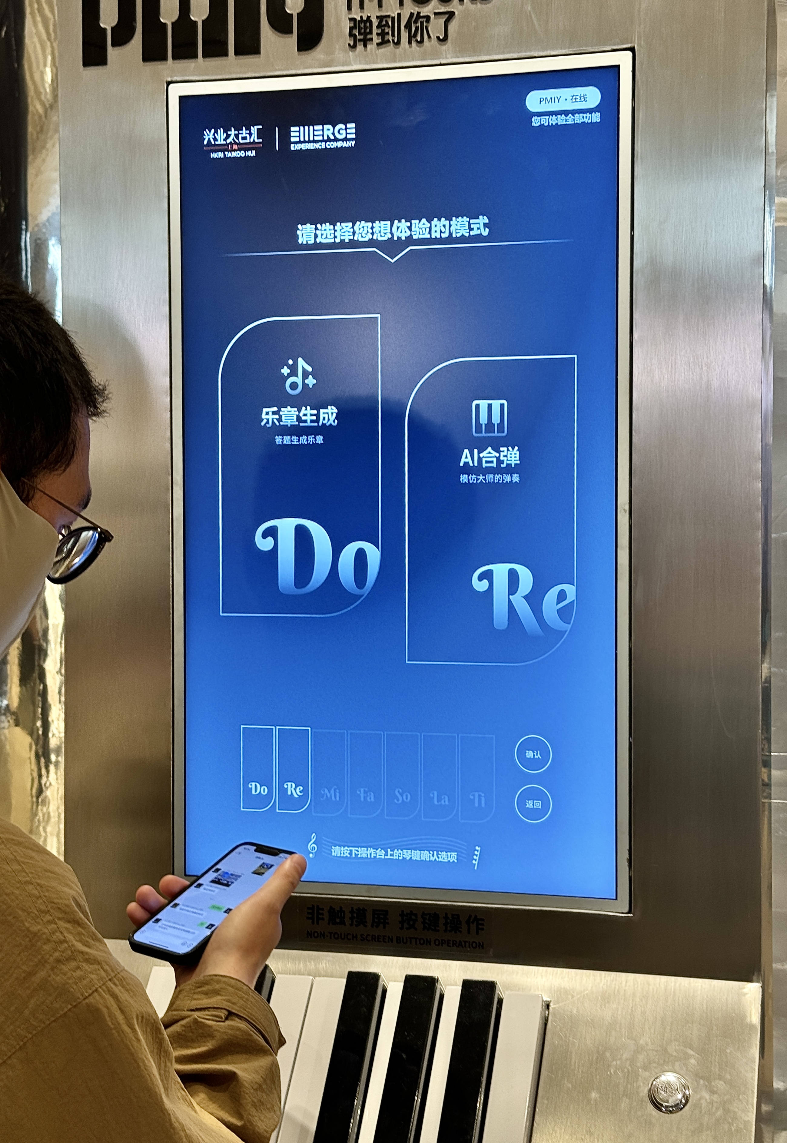 据了解,本次活动上的这个巨型装置主角是一台搭载了“乐章生成”及“AI合弹”两种AI玩法的定制钢琴。通过“乐章生成”玩法,消费者可以根据屏幕指示,键入契合个人喜好的选择,即可通过AI生成一首展现自我个性的音乐作品,并收获专属动态单曲封面,生成的音乐或曲谱也可通过扫描二维码进行下载,将属于你的旋律收藏或分享给更多伙伴。如果更享受即兴弹奏的乐趣,选择“AI合弹”模式,在1分钟内随意发挥,AI将与你现场实时合奏演绎,打造独一无二的“个人音乐会”。