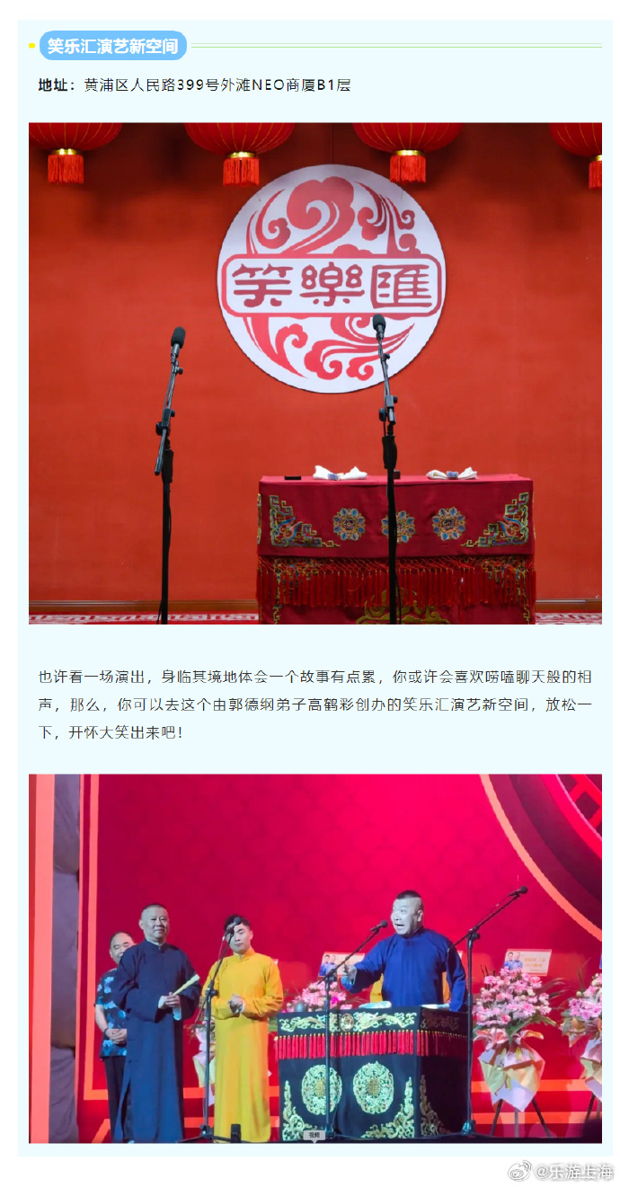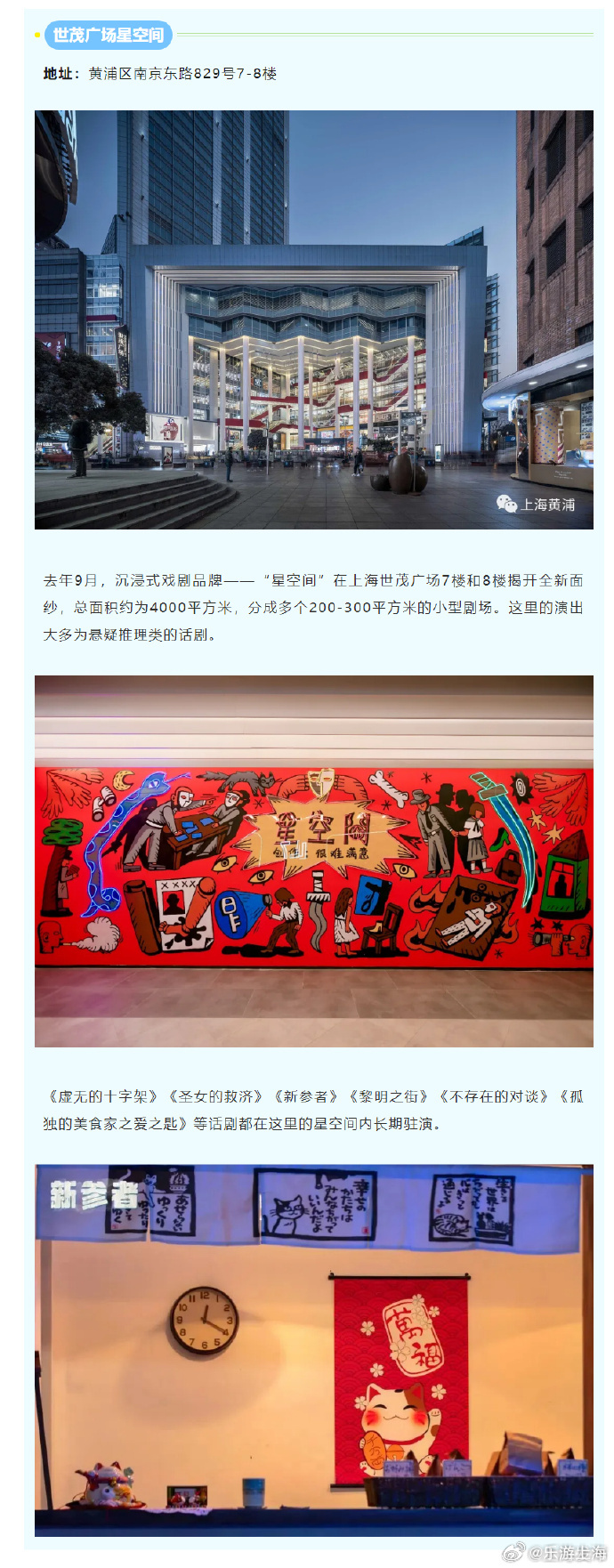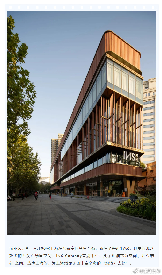 #上海新一轮100家演艺新空间名单公布#,听说时尚潮人都来这里看戏。近日,上海公布了新一轮100家演艺新空间名单,其中新增了17家,有观众熟悉的世茂广场星空间、INS Comedy喜剧中心、笑乐汇演艺新空间、开心麻花I空间、蜚声上海等,为上海增添了更丰富多彩的“观演好去处”。