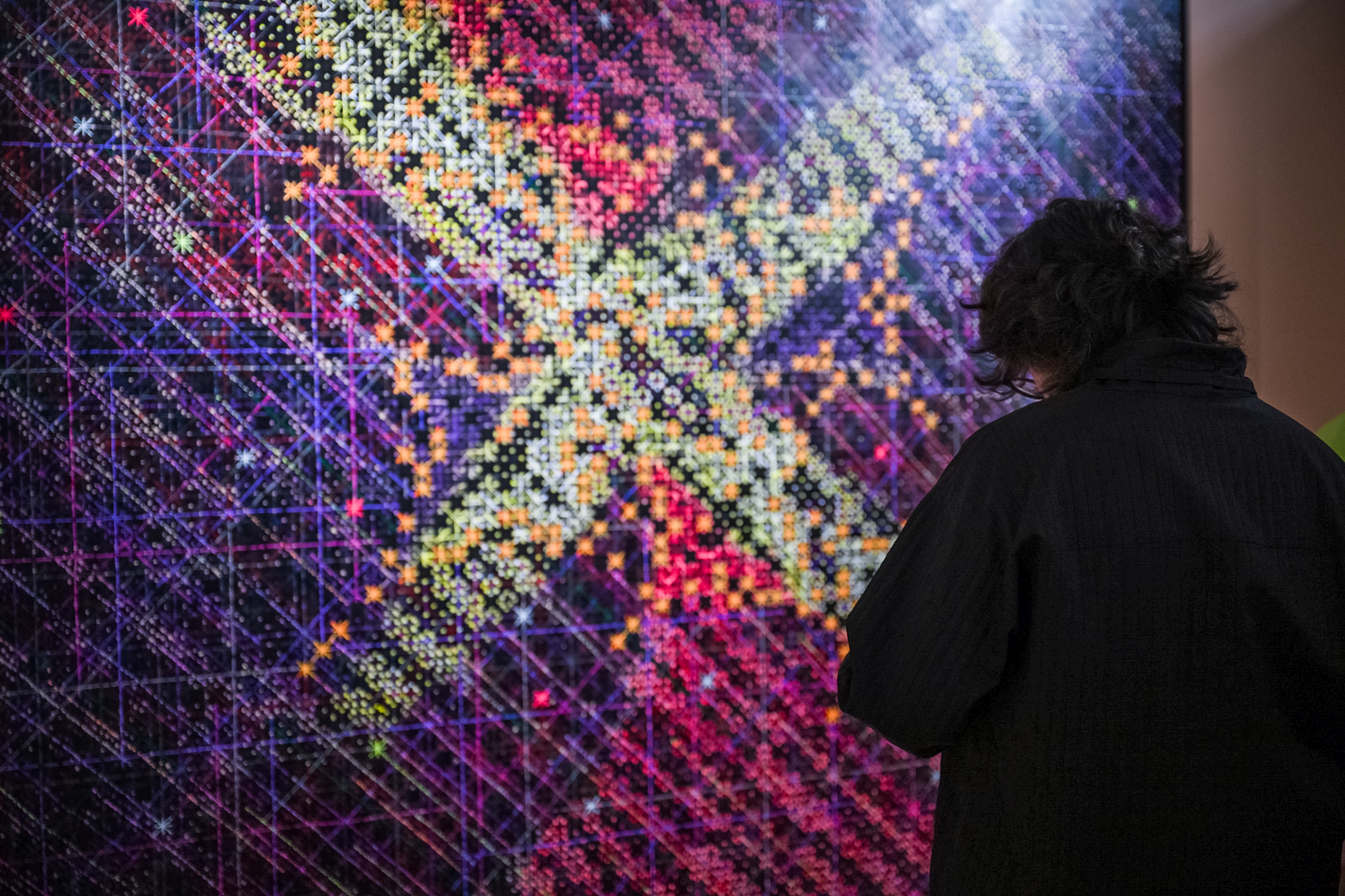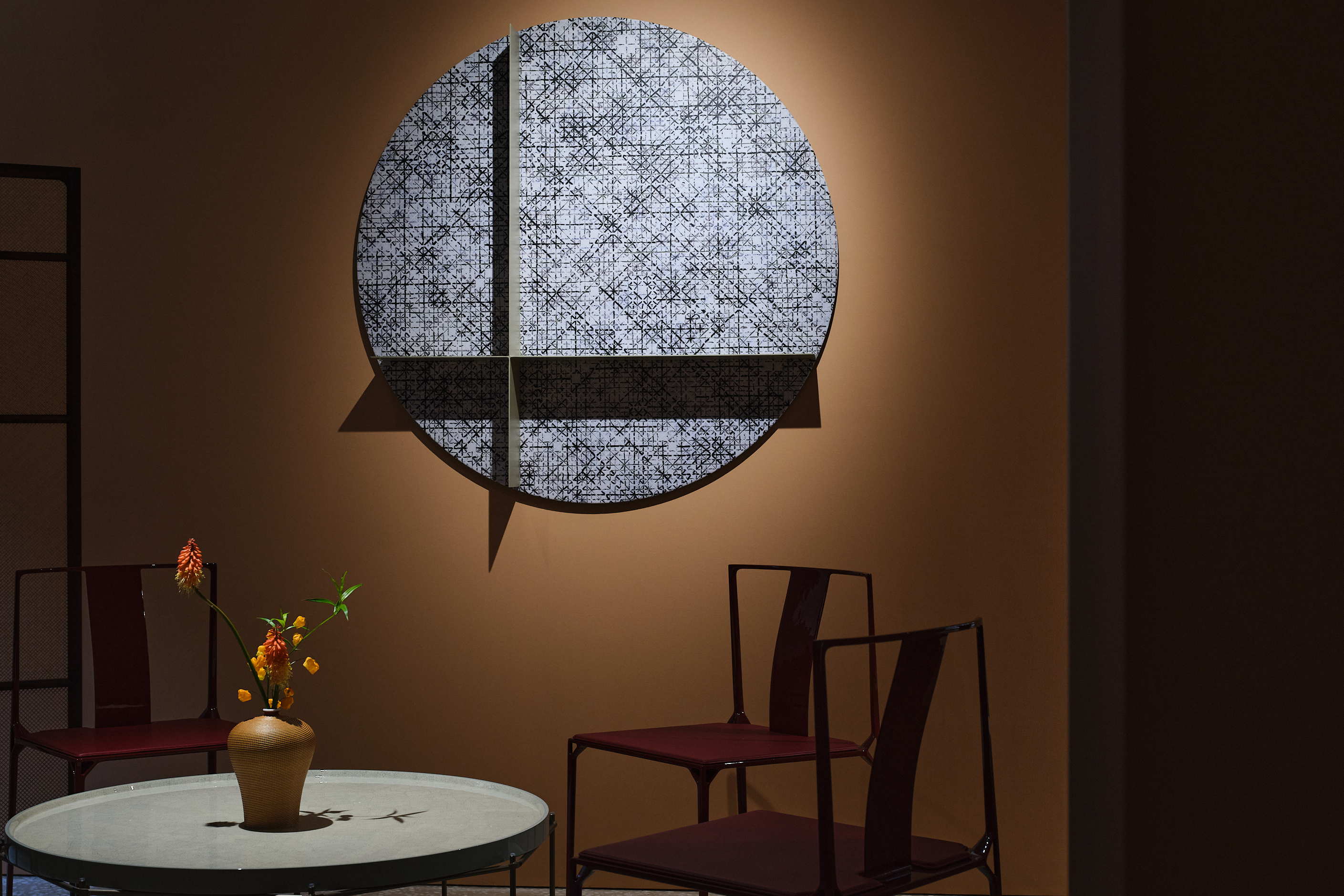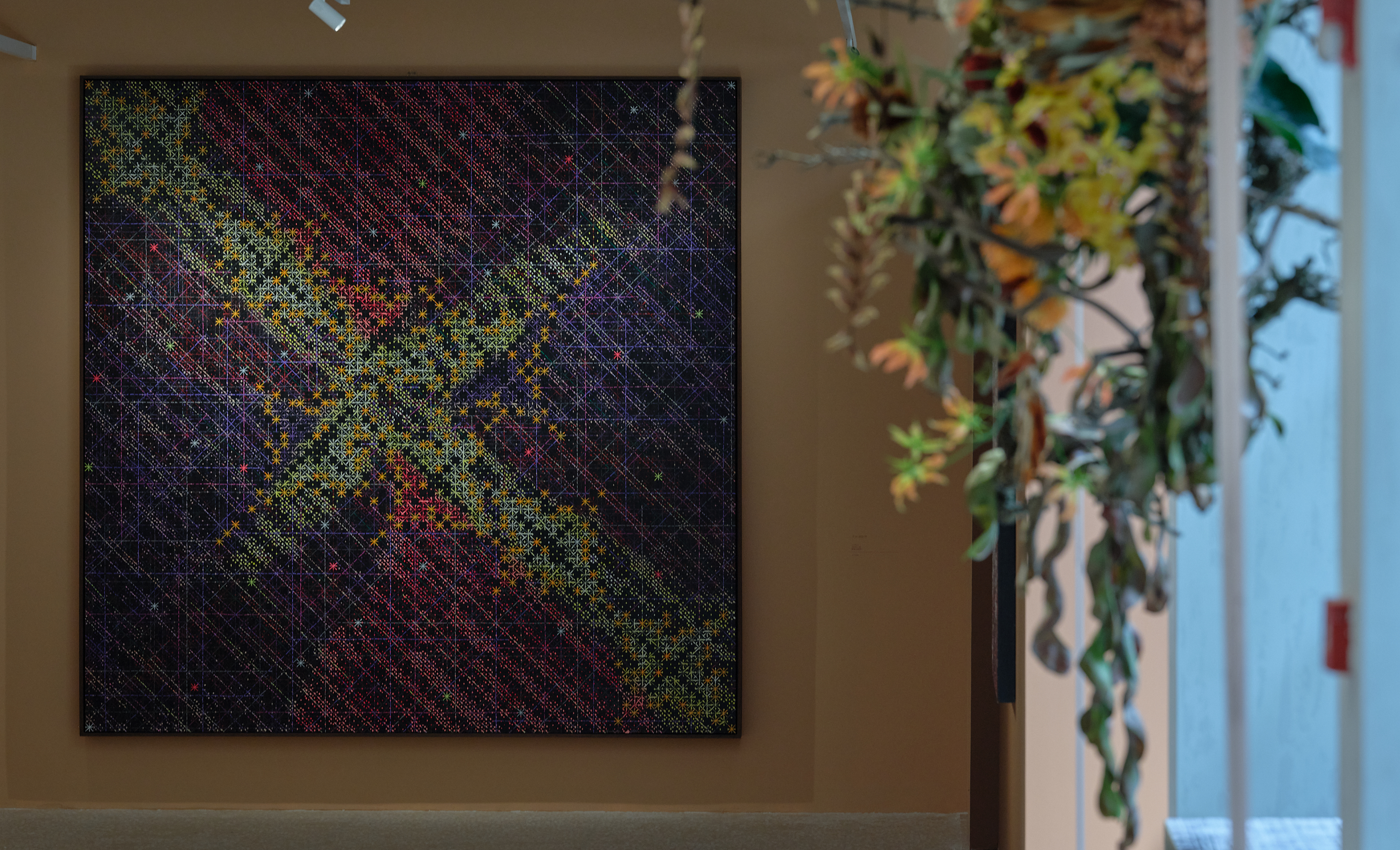 艺术家丁乙《十示》系列中的《2020-3》与《2021-19》两件作品也在现场吸引了不少眼球。丁乙将十字作为视觉语言,以理性抽象与感性经验的结合,赋予时间与空间无限的可能。此外,“故乡”是艺术家丁乙创作中永恒的母题。从上海到世界,似乎能在《十示》系列中看到几何与数理、星系与坐标、离散与归途等主题,以重复且精确的视觉符号记录时代。