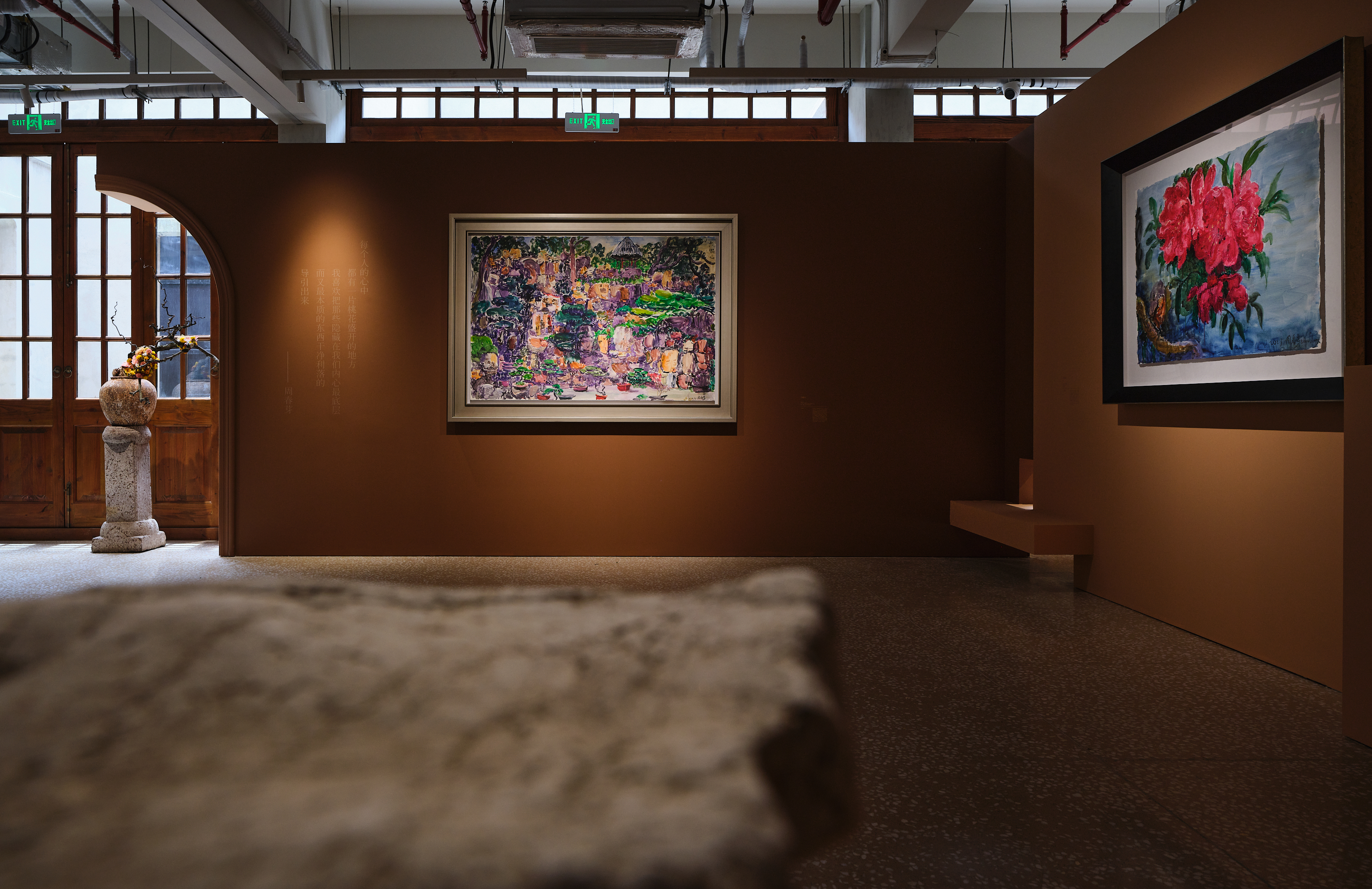 艺术家周春芽的《大假山》与《江水东》桃花系列,是人与自然的情感共振,汲取上海文化精髓,以色彩作为情绪,艺术家将中式园林、山水画中常见的意象:假山与桃花赋予了强烈的对照色彩,放大物的肌理与质感,予静物原始与澎湃的生命力——人、大都会与自然的碰撞在此得到体现。