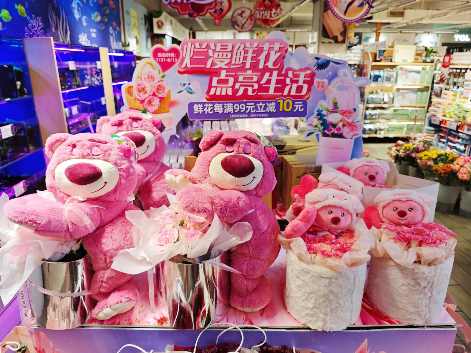 “今年我们的礼品花性价比拉满,有花盒、花束、玩偶抱抱花束,从39.9元到199元,近10款样式、价格齐全。”七夕,鲜花的热度自是居高不下。大润发鲜花采购表示,同期店内上市北极光、美人鱼、极光薄荷等厄瓜多尔同款复色玫瑰,售价仅为进口的1/4。更新鲜、更丰富、更低价,业务从品质、种类、价格层面不断升级,同时节日里高品质与创意的鲜花选择,也为超市场景选购增添更多惊喜与花样。
