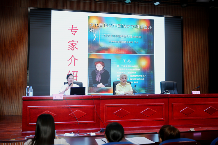 语言不仅是沟通交流的工具,也是文化传承和表达的载体。一个国家或民族的语言文字水平,往往与其文化自信紧密相联。本次推普大会还邀请到了第十三届全国政协委员、上海戏剧学院表演系教授配音演员、配音导演、教育部国家一流课程学术带头人、获2021年度上海市“四有”好老师(教书育人楷模)称号的王苏教授,为教师们作“文化自信从中国的文字和语言开始——学会如何用声音和语言绘画”的专题讲座。王苏教授的讲座立体而生动,“绘声如画,声情并茂”,一次带来视听享受的语言文字讲座令老师们见证了语言的魅力和诵读的力量。