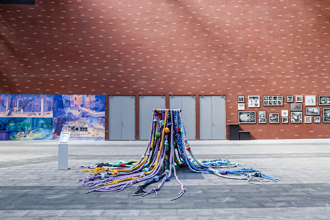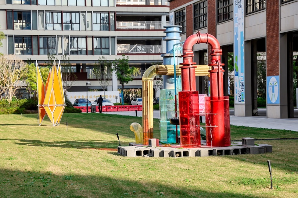 户外草坪区域,艺术装置与绿地景观相映成趣。《风的漫游》将无形之风化为可见的数据韵律;《管见之荡·循环新生》用钢铁与竹筒的巧妙嵌合,探讨循环再生的永恒主题。中庭天光下,“风起海上・绘见中国”插画项目为硬朗的工业遗产空间注入了感性的色彩。