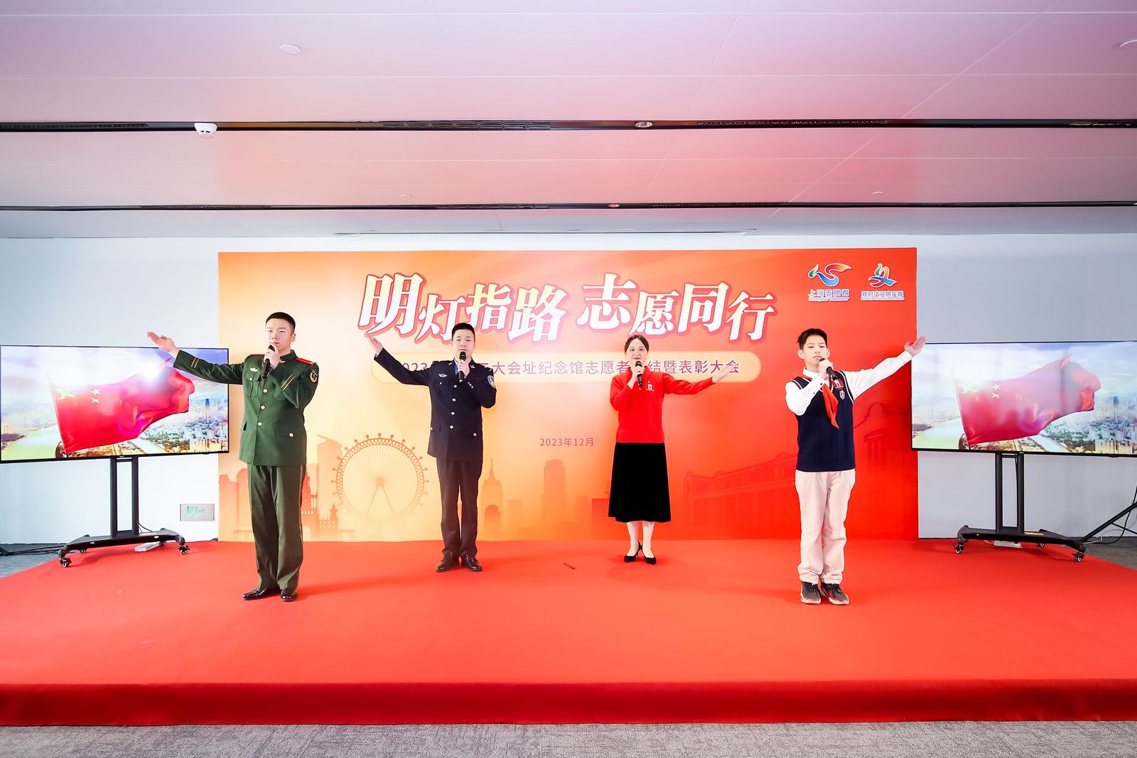 上海,党的诞生地,初心始发地,伟大建党精神孕育地。静安区作为中国共产党早期活动的核心区域,有着深厚的红色基因和丰富的红色资源。来自上海机场出入境边防检查站“百人外语志愿服务队”志愿者代表、上海市市西初级中学教师志愿者代表、武警上海总队执勤第三支队五中队部队志愿代表以及静安教育学院附属学校青少年志愿者代表共同带来了诵读展演《百年石库门 启航新征程》,站在新征程的起点上,持续凝聚志愿力量,弘扬志愿精神。